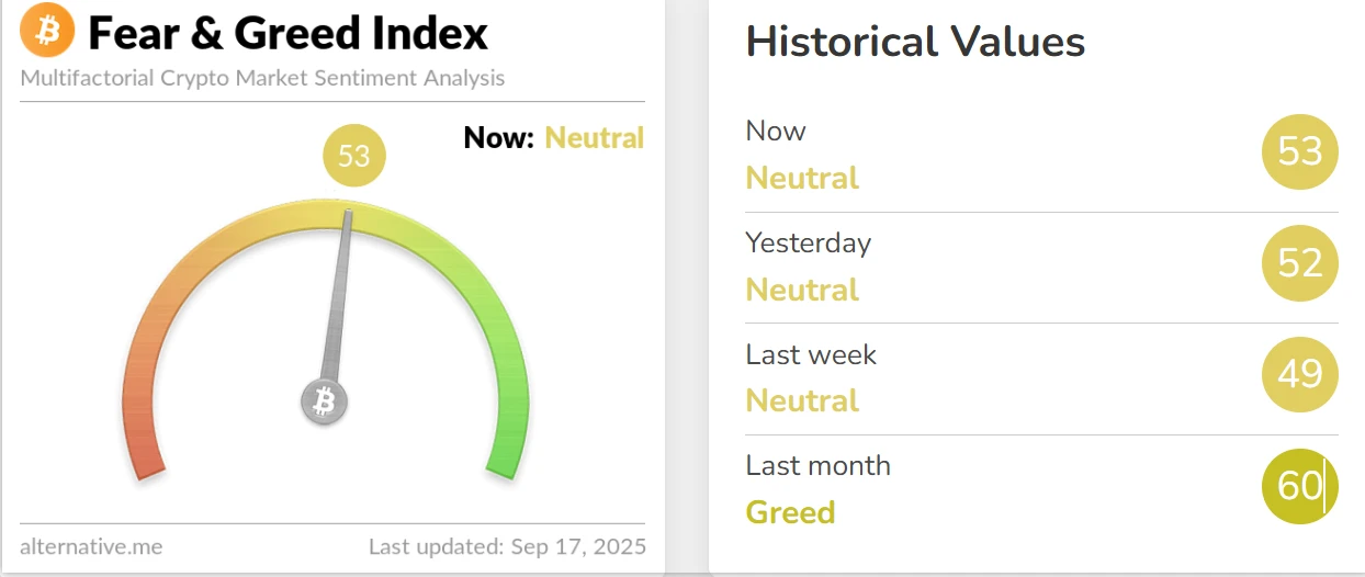 加密货币恐慌与贪婪指数连续两日攀升,市场情绪维持中性 admin 2025-09-17 09:18:07 12 9月17日,Alternative.me数据显示加密货币恐慌与贪婪指数当日升至53,较前一日的52实现连续两日攀升,当前市场情绪仍处于中性区间。 <<Tether CEO披露公司利润率高达99% 某鲸鱼向Kraken存入2600枚ETH,仍持近10877枚>> 你可能还会对下面的内容感兴趣: 7月1日加密货币恐慌与贪婪指数报64,连续两日维持贪婪区间 加密货币恐慌与贪婪指数降至63,连续两日维持贪婪区间 加密货币恐慌与贪婪指数升至75 市场情绪维持贪婪状态 加密货币恐慌与贪婪指数升至50 市场情绪维持中性 加密货币市场情绪转中性 恐慌与贪婪指数升至49 加密货币恐慌与贪婪指数降至48 市场情绪维持中性状态 加密货币恐慌与贪婪指数攀升至57,市场情绪转为贪婪 加密货币恐慌与贪婪指数降至53,市场情绪转为中性 加密货币恐慌与贪婪指数连续两日攀升,市场情绪维持中性 加密货币恐慌与贪婪指数小幅上升,市场情绪维持中性